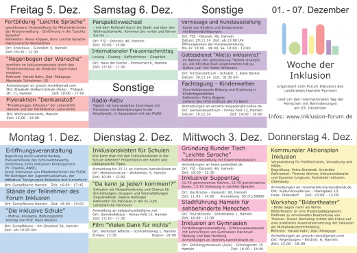 01. bis 07. Dezember: Woche der Inklusion 14. November 201428. April 2021 Herzlich einladen wollen wir an dieser Stelle zur „Woche der Inklusion“. Eine Programmübersicht finden Sie hier (zum Vergrößern bitte anklicken):