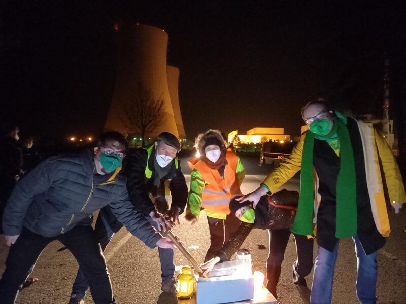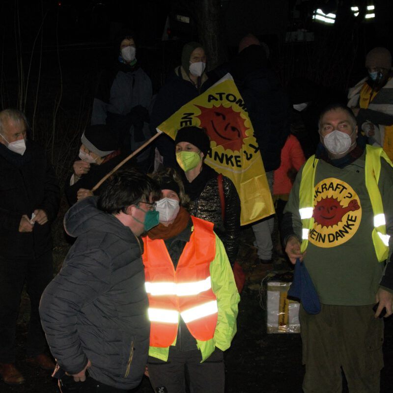 In der Silvesternacht haben wir mit rund 120 Atomkraft-Gegnerinnen das AKW Grohnde symbolisch abgeschaltet. Die Göttinger Aktivistinnen hatten dafür einen „Abschalthebel“ gebastelt, der um 0,00 Uhr symbolisch umgelegt wurde und vielen als Kulisse für schöne Erinnerungsfotos diente. Das erste atomstromfreie Jahr im Weserbergland seit 1985 haben wir dann mit Gesang begrüßt. Von der Bühne wurde getrommelt und gesungen: Bye, bye Atomkraft – bye bye! Und viele stimmten ein. Nach über 45 Jahren erbittertem Widerstand gegen dieses Atomkraftwerk, wird an diesem Standort kein neuer Atommüll mehr produziert. Was uns bleibt ist ein schweres Erbe, das uns Verantwortung für die Ewigkeit aufbürdet. Auch das wurde in zahlreichen Wortbeiträgen thematisiert – und die Solidarität erklärt mit den Initiativen gegen ungeeignete Lagerstätten, wie dem Schacht Konrad für schwach- und mittelradioaktive Abfälle und der geplanten Deponie im stillgelegten Steinbruch Ith für freigemessene und aus dem Atomrecht entlassene aber noch immer reststrahlende Abfälle aus dem Kontrollbereich des AKW Grohnde. Auch das geplante Bereitstellungslager im Dreiländereck Würgassen wurde als ungeeignet thematisiert. Und so starteten wir mit gemischten Gefühlen in das neue Jahr – voller Erleichterung über das abgeschaltete AKW und mit der großen Verantwortung, die uns jetzt noch immer zufällt.