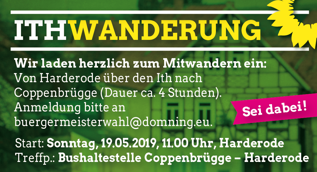 Die Grünen in Coppenbrügge wandern am Sonntag, den 19. Mai 2019 von dem entferntesten Ortsteil des Fleckens bis in das Zentrum von Coppenbrügge und laden zum Mitwandern ein. Sie starten um 11:00 Uhr in Harderode (Bushaltestelle: Coppenbrügge – Harderode) und wandern über den Ith in den Kernort. Es ist geplant, mit einem Bus von Coppenbrügge nach Harderode zu fahren. Hierzu werden feste Anmeldungen bis zum 17. Mai 2019 benötigt (bitte unter buergermeisterwahl@domning.eu). Bei wenigen Anmeldungen wird einen Transfer mit Privatfahrzeugen organisiert.