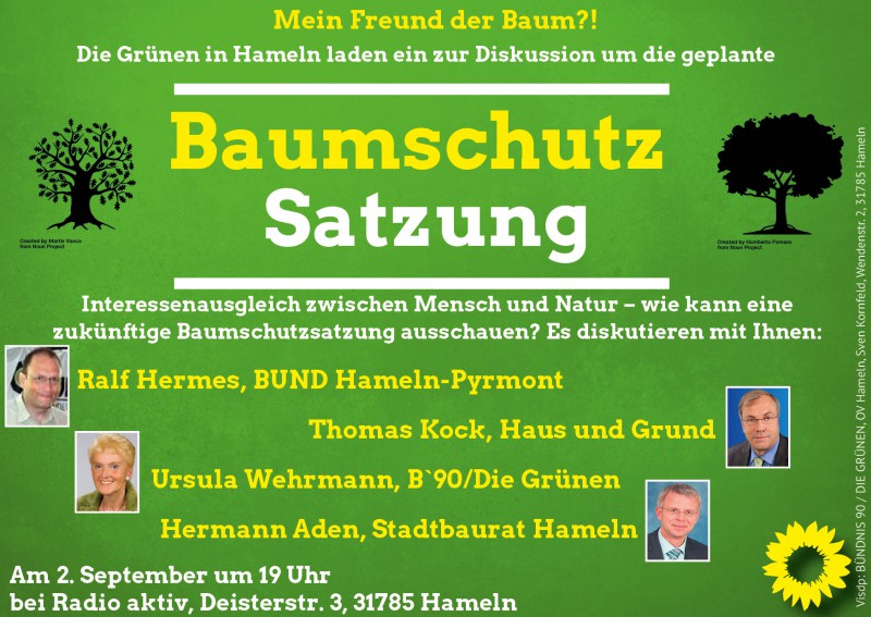 Die geplante Änderung der Baumschutzsatzung der Stadt Hameln steht am Mittwoch, 2. September um 19 Uhr im Mittelpunk einer Diskussionsveranstaltung zu der die Hamelner Grünen alle Bürgerinnen und Bürger herzlich in die Räumlichkeiten von Radio aktiv einladen. „Interessenausgleich zwischen Mensch und Natur – Wie kann eine zukünftige Baumschutzsatung ausschauen?“ lautet die Frage, der mit den geladenen Gästen Ralf Hermes,BUND; Thomas Kock, Haus und Grund; Ursula Wehrmann, B`90/Die Grünen und dem Hamelner Stadtbaurat Hermann Aden auf den Grund gegangen werden soll. Die seit 1997 bestehende objektbezogene Baumschutzsatzung war nach den Fällungen der Bäume am Fischerhof stark in die Kritik geraten. Die Hamelner Stadtverwaltung schlägt nun eine flächendeckende Baumschutzsatzung, wie z.B. in den Städten Hannover, Hildeshein und Lehrte vor. Doch was bedeutet objektbezogen und flächendeckend, welche Auswirkungen haben die unterschiedlichen Varianten auf die Bürgerinnen und Bürger sowie auf die Bäume im Stadtgebiet. An diesem Abend sollen die verschiedenen Varianten erörtert und Fragen beantwortet werden. „Wir freuen uns wenn sich viele Bürgerinnen und Bürger in die Diskussion einbringen – nur so werden wir eine Lösung finden, die einerseits den Schutz im Sinne der Natur und der Bäume in den Mittelpunkt stellt und andererseits Aktzeptanz und Unterstützung bei den Bürgerinnen findet.“, so Sven Kornfeld, Vorsitzender der Hamelner Grünen.